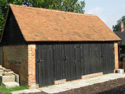 The barn was repaired with as few alterations as possible. After monitoring the walls for several months to check that there was no current movement, Jo re-pointed the end walls with lime mortar and the filled the cracks. Then the expert builders arrived. All the tiles had to be carefully removed from the roof and stacked for re-use. The roof was straightened and a few rotten timbers were replaced. Some extra timbers were inserted to brace the roof to prevent future sideways movement. |