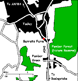 Burrells Farm is situated on the A340 (Main Road) to the south of Tadley, opposite Knapp Lane. The farm is on the west side of the A340, approximately 100m north of the old Fighting Cocks pub.