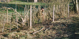 | Three of the hedgerows have been laid in a traditional style. First the hedge is prepared for laying. This involves removing the rusty old barbed wire fencing and any rubbish, removing any undesirable species such as elder, bracken and brambles, taking out any dead or diseased wood, and trimming the sides. Next a row of stakes are hammered in a line down the centre of the hedge. These are hazel poles cut from the hedge trimmings. Next the hedge is laid, a stem at a time, and woven between the stakes to hold it firm. |