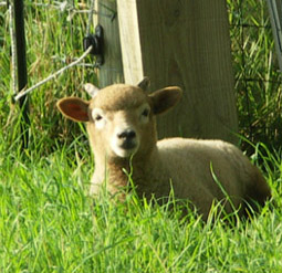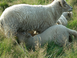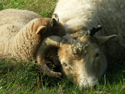 | The ram is put in with the ewes for two months, usually during November and December. The lambing starts five months later. The ewes are brought into the lambing barn in the farmyard to give birth to their lambs. After a few days here, they can go back into the fields. The lamb can stand only a few minutes after it is born - it needs to find a teat and have a good drink of milk to keep it warm and alive. Portland sheep normally only give birth to one lamb each year. The ewes protect their lambs, and take turns babysitting each others lambs! The lambs love to get together and play while their mothers graze. |