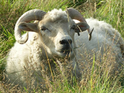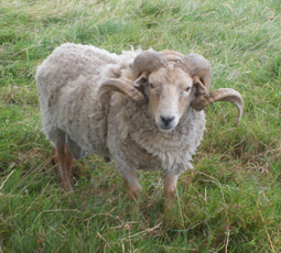 | Portland sheep come from Portland in Dorset. They are small, with a creamy fleece, a tan face and legs and curved horns. The lambs are born a much darker colour, in various shades of brown. As they grow, their fleece grows paler. They are ready to eat when they are about 16 months old. The Portland sheep is said to produce the very finest mutton. It is traditional with the Portland sheep to leave the tail intact and not dock it as is done with most other breeds. That is why our sheep have long tails. |